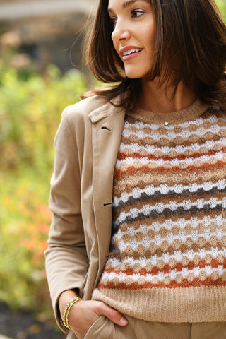 Drew's Pinwale Corduroy Jacket Adds a Modern Twist for Fall! This Lightweight Camel 5 Button Jacket Pairs Back to the Coordinating Wide Leg Trouser for a Polished Fall Look!