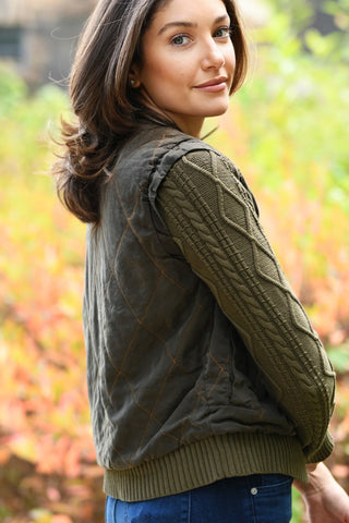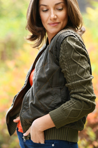 Elevate your outerwear with the Hello Night Hunter Jacket, featuring a quilted zip-front design and intricate cable knit detailing in a rich hunter green. This jacket combines refined texture with practical warmth, creating a sophisticated look perfect for crisp days. Its tailored fit and durable finish ensure both elegance and comfort in cooler weather.