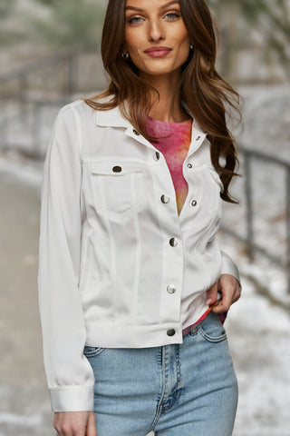 Peace of Cloth’s Pearl Satin Jacket Adds a Luxurious Spin On a Jean Jacket! This 22" Snap Front Jacket is the Perfect Piece to Wear back to Jeans to Dresses or Pair with the Coordinating Black Cargo Pants for a Fabulous Suit for Travel!
