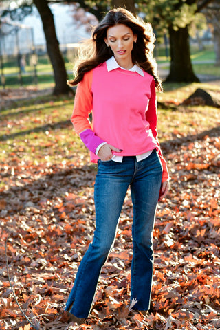 Lisa Todd's Block Talk Pink Sweater Adds a Pop of Color to a Grey Winter Day! This Classic Crew Neck Comes Alive with Blocks of Brights on Your Sleeves to Contrast the Hot Pink Body! Update Your Denim or Pair with Pistola's Vegan Leather Jean for a Little Sizzle for the Holidays!