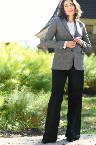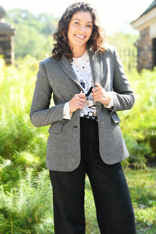 Milly's Palmer Jacket is a Cool Tweed Classic! Pair this Charcoal Tweed One Button Boyfriend Blazer Over a Pattern Cashmere Sweater, Trousers and Loafers for a Menswear Look You'll Love!