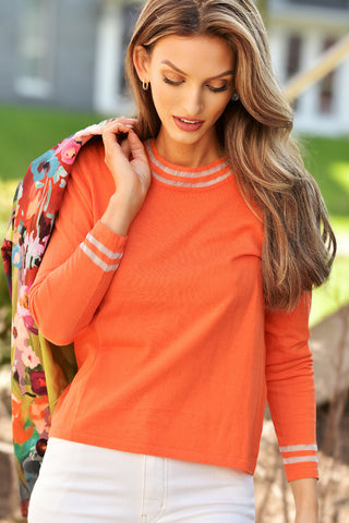 Peace of Cloth Adds a Pop of Orange for Spring! Pair this Lightweight Crew Neck Accented with Sheer Trim for a Layer of Color Under Estelle & Finn's Floral Jacket and Pant!