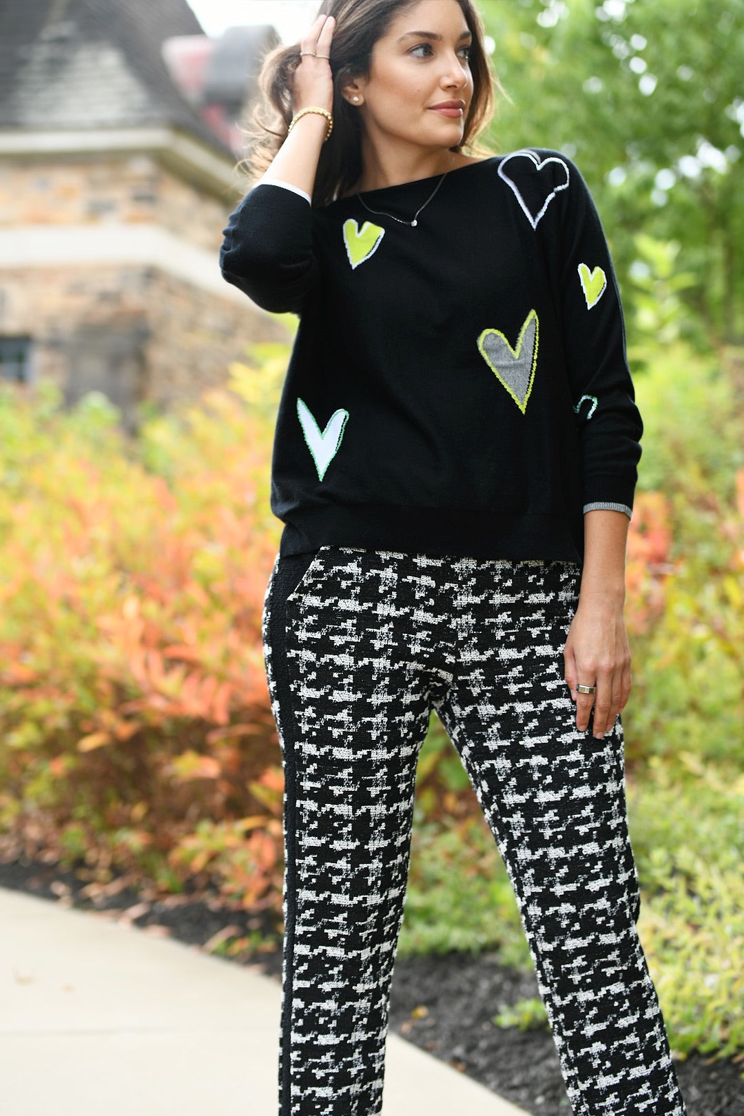 Add Avenue Montaigne's Pull On, Frank Retro Trouser to Your Fall Line Up! Love the Bold Boucle Black/Creme Pattern Pant with Black Track Stripe Paired with Zaket & Plover's Relaxed Abstract Heart Sweater for a Fun Play on Pattern Vibe for Fall '25!