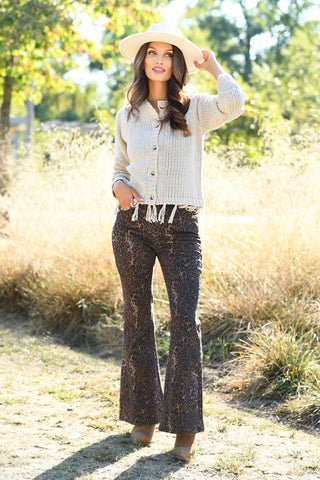 Drew's Wheat Button Front Cardigan with Fringe Hem Adds a Twist of Fun for Fall! This Lofty Cardigan is the Perfect Piece to Pair Back To A.Z.I's Leopard Flare Pant for a Fresh Fall Finish!