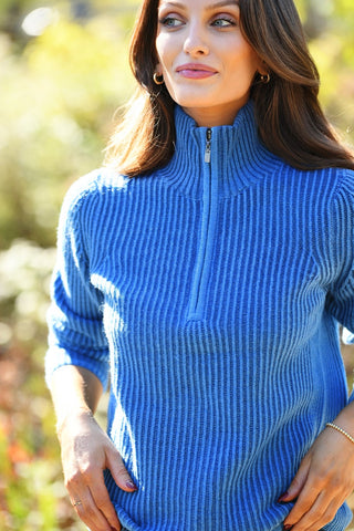 Cozy Meets Cool Wearing Kinross' Blue Cashmere-Plated 1/4 Zip Sweater. This Soft,2 Tone Blue Cashmere Wraps You in Warmth While the Quarter-Zip Adds a Sporty Twist. Pair with Denim for a Perfect Casual Work to Weekend Look!