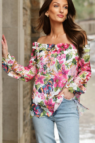 A.Z.I.’s Floral Top Adds a Little Sass for Spring! This Bateau Bouquet Top Looks Lovely Worn On or Off the Shoulder Paired with Black, White Pants or Elevate Your Denim for a Fresh Way to Welcome a New Spring Season!Â