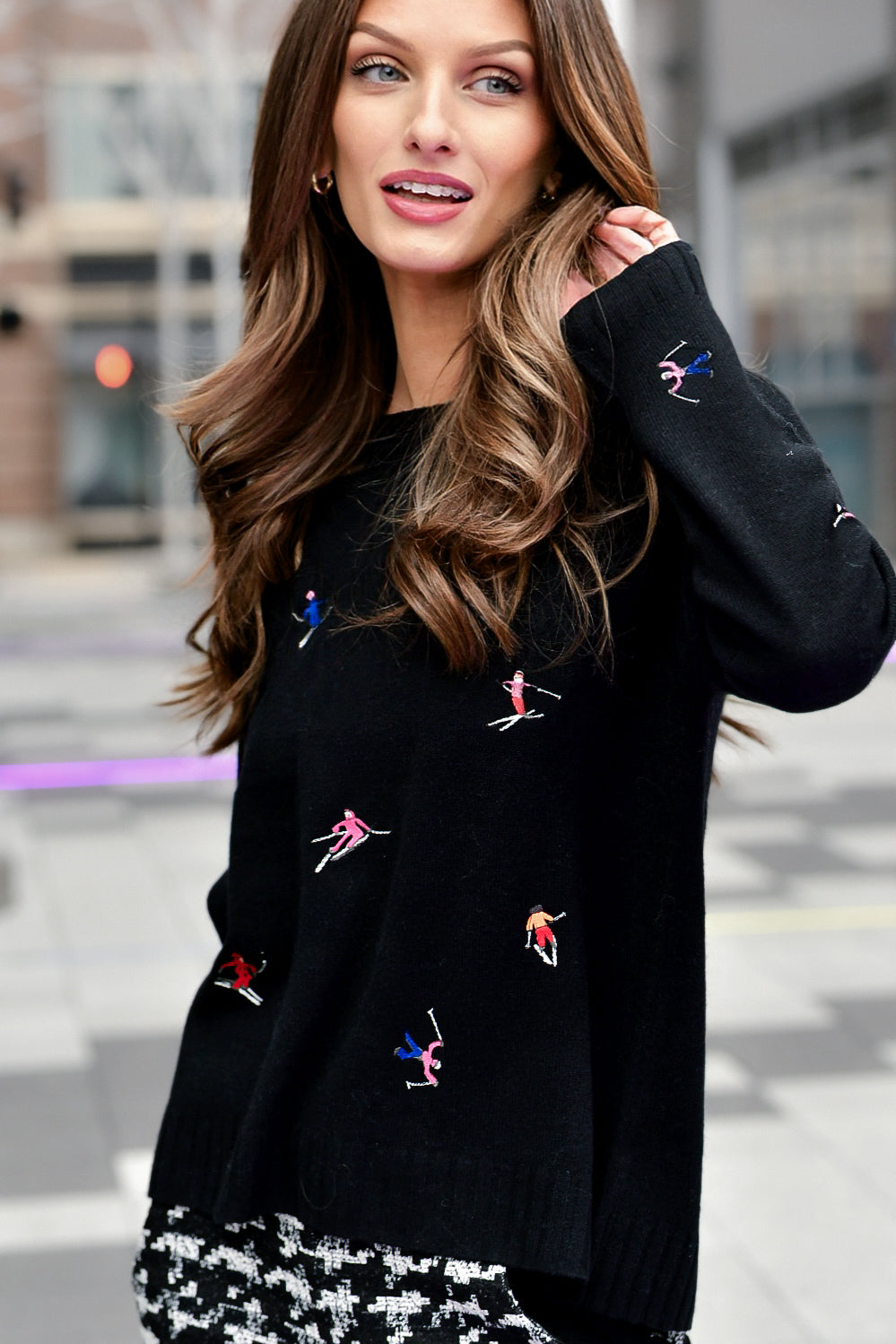 'Tis the Season for Skiing!!! Hit the Slopes in Style Wearing Lisa Todd's "Slopes" Sweater! This Black Cashmere Crew Neck is Scattered with the Brightly Stitched Members of the LISA TODD Ski Team Swooshing Down the Slopes! A True Conversation Starter...Coming and Going!